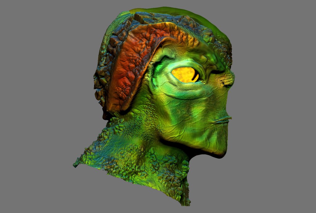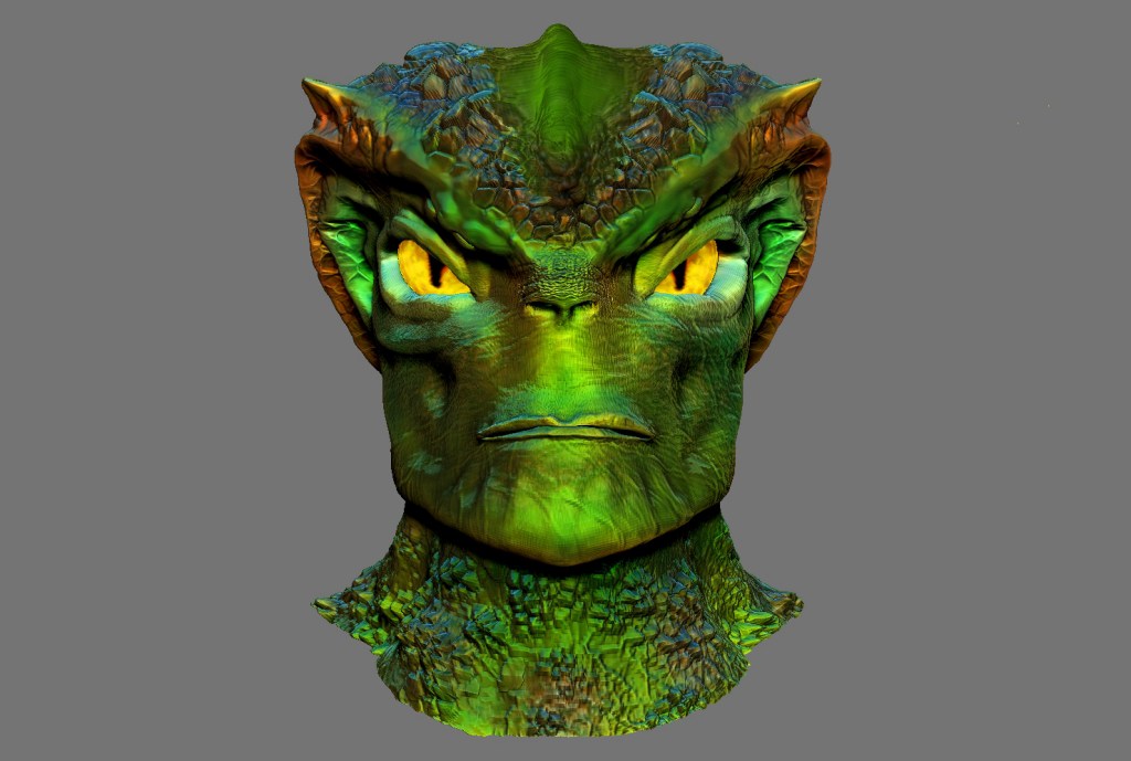 I sculpted a reptilian humanoid, taking into account inspiration from the features of a human face, the scale patterns of a lizard, and the rugged textures reminiscent of a crocodile’s skin.